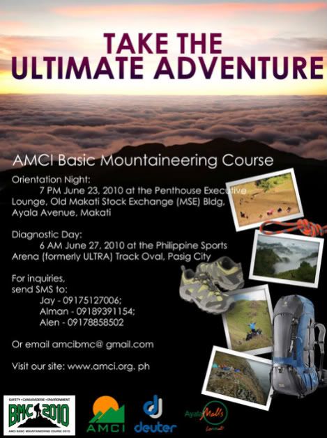 The AMCI Mountaineering Club, Inc. invites you to join the 2010 Basic Mountaineering Course (BMC)! The BMC is a four-month training program which includes the following activities: • Tent pitching • Trail movement • Stove manipulation • Meal planning • Land navigation • Wall climbing • Rappelling • Ropemanship • Running and other physical exercises • Basic First Aid • Basic Life Support To learn more, you are invited to attend the BMC 2010 Orientation Night on June 23, 2010 (Wednesday), 7PM, at the Penthouse Executive Lounge, Old Makati Stock Exchange (MSE) Bldg, Ayala Avenue, Makati. You can also inquire during our Photo Exhibits at the following dates and venues: • June 1 (Tuesday) to June 6 (Sunday) – Greenbelt 1 Lobby • June 7 (Monday) to June 13 (Sunday) – Glorietta 4 Cinema Lobby • June 14 (Monday) to June 20 (Sunday) – Trinoma Cinema Lobby For inquiries, • SMS: Jay - 09175127006; Alman - 09189391154; Alen – 09178858502 • Email: amcibmc@gmail.com • Website: www.amci.org.ph |
